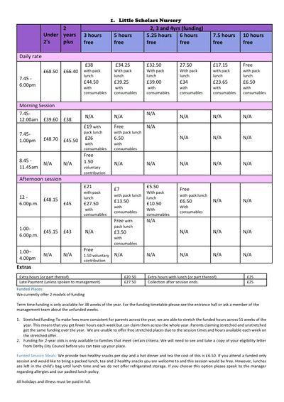 We offer 2, 3 and 4 year old funding. The funding can be used in a number of different ways ,we offer funded only sessions and wrap around care sessions with funding taken off, We also offer stretched funding for all year round sessions.